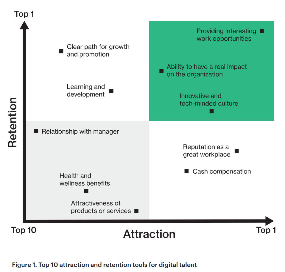 There are two key takeaways from this finding. First, your organizational brand is critical to ensure potential digital-talent hires perceive your organization the right way. Second, communication and transparency are key for an effective retention strategy, especially in providing clarity and transparency to digital talent regarding role and career opportunities.